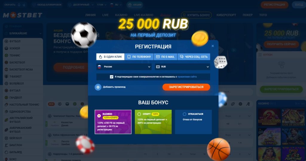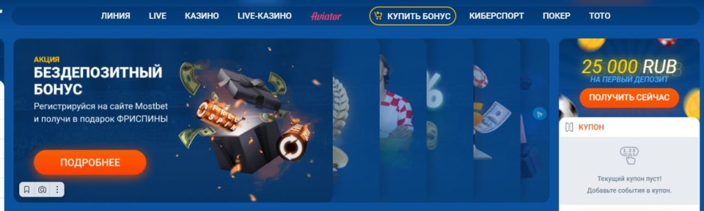 При регистрации нового аккаунта на официальном сайте Мостбет можно получить щедрый бонус в размере 25000 рублей на свой счёт и несколько фриспинов. Для этого необходимо после регистрации создать перевод денежных средств в пользу своего кошелька на платформе Мостбет. Собственно говоря, размер бонуса составляет 125 процентов от первоначального взноса, но не более 25000 рублей.